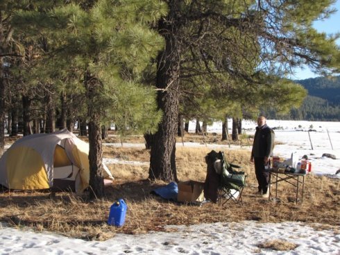 Photos, top to bottom: Collared Hawks Nest pack wolf, courtesy of USFWS, Camping in the recovery area, courtesy of Jean and Peter Ossorio, Mexican wolf in Hawks Nest territory, courtesy of Jean Ossorio